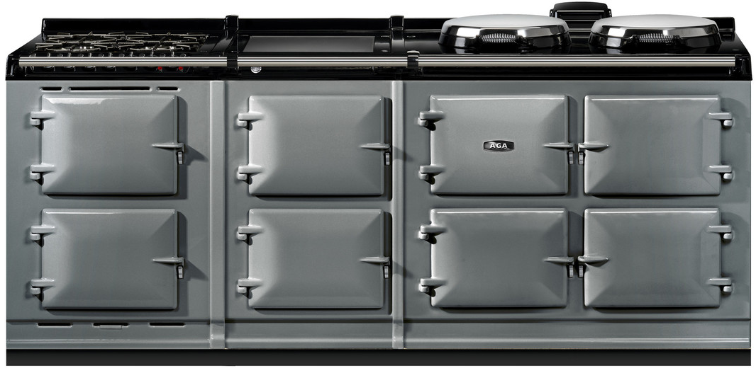 The R7 offers classic AGA styling and boasts the gleaming vitreous enamel finish which takes three days to achieve at our factory in Shropshire, England. Built and manufactured to our meticulous standards, these models feature three cast-iron ovens and two independently controlled hotplates (boiling and simmering plates), while the 150 models feature two additional ovens for slow cooking and warming, and the choice of either a warming plate or a single-zone induction cooktop.These ranges are highly detailed, from the AGA embossed cast-iron oven doors to the branded handrails and black flush fitting side panels.