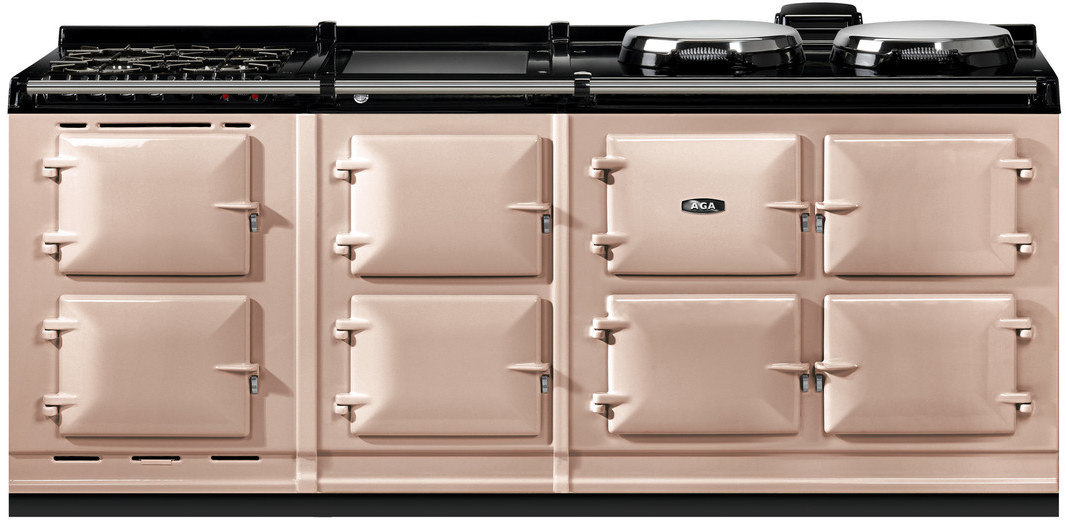 In addition to all the features of your main AGA R7 100 range, this 210 model configuration provides ample cooking space with slow cook and warming ovens, a large warming plate atop one of the hotcupboards, as well as an additional conventional oven with electric broiler, convection oven with fan, and 4-top gas burners.