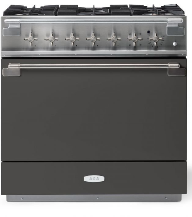 The AGA Elise 36" Dual Fuel Model features one large multifunction oven with seven settings including true European dual-convection cooking, fan-assisted baking, browning, thaw and serve, convection broiling, warming, and conventional cooking. A continuous cast-iron cooktop features five powerful sealed-brass burners providing easy cleanup and preventing messy spills from reaching the oven or internal components.Read More