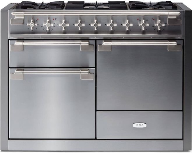Complimented by stunning new cruciform knobs with knurling, shipped standard in brushed nickel, but also available as after-market options in five additional versatile hardware finishes (polished chrome, polished brass, polished copper, brushed brass, and black anodized aluminum), the re-imagined AGA Elise 48" dual fuel model confidently steps into the spotlight along side its classic AGA siblings.