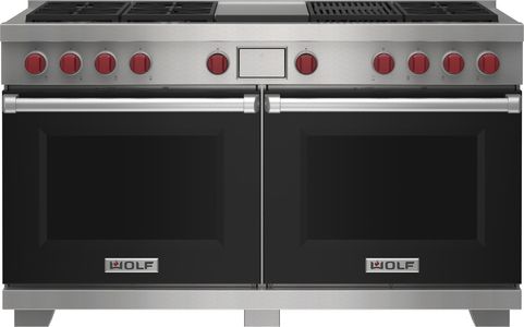 Wolf® 60" Black Freestanding Dual Fuel Range and Infrared Charbroiler and Infrared Griddle features dual-stacked, sealed burners, Dual VertiFlow™ convection system, Gourmet Mode, 10 chef-created cooking modes, LED backlit control bezels, self-clean, delayed start, timed cook, and Sabbath features.Read More
